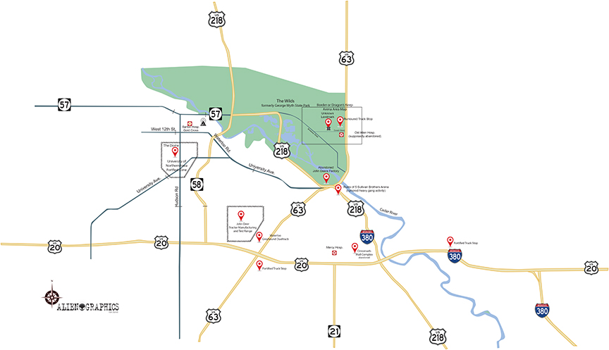 The Wilds, formerly George Wyth State Park. The gangs avoid it. Sightings of strange creatures have been reported by travelers on US218. Rumors of campers disappearing from campsites abound. Supposedly, when the food riots hit, the local zoo transported the entire population to the park and released them. Campus Security warns “Do NOT stop for ANY reason along this corridor of US218”.