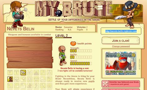 As I said it’s completely random. Not much to do other than sit and watch your little guy/gal fight your chosen opponent, though the animations are cute. I will admit that if you sign on by clicking to fight my brute, you become my pupil and I gain experience when you do.