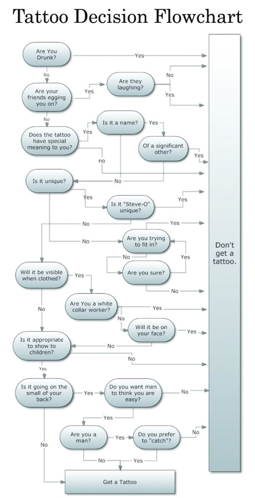 1. Hmm…Looks like that flowchart’s approach is that everyone except these people should get a tattoo. Chart bias! 🙂