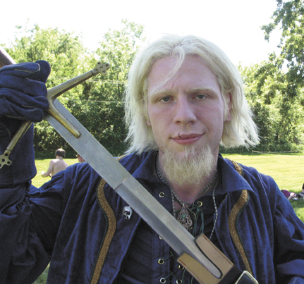 The Brotherhood of the Steel is a volunteer organization that demonstrates sword fighting. Their members train for a year and half with wooden mock-ups before they are allowed to fight with metal swords. Stavolin, a Norse Guard has been sword fighting for more years than he can remember. He suffered an injury during the weekend and had his fight permit pulled.