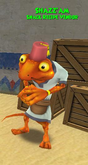 Shazz’am is the Snack Recipe Vendor in Krokotopia. He is located in the west area of The Oasis.