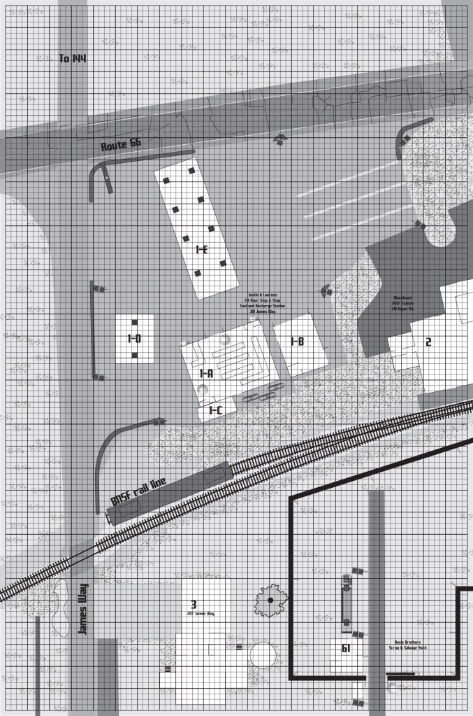 1 – Justin & Lauren’s 24 Hour Stop & Shop Recharge and Fueling Station – 301 James Way, 3 Buildings; Mini Mart (1-A 6 DP), Garage (1-B 4 points metal armor), and storage out back (1-C 3 points metal armor), 2 covered fueling areas; the auto area (1-D canopy only, 2 large supports at either end of the fuel pump / recharge island 25 DP if one of the supports is taken out, the 17,500 lb canopy will collapse on everything underneath it) can handle 4 electric or 2 gas at one time, the truck area (1-E canopy only, 2 large supports at either end of each fuel/recharge station 35 DP, due to the number of supports the canopy will only start to collapse once half the supports are gone. Partial collapse will occur if both supports for one fuel island are destroyed, each section weighs 17,500 lbs.) can handle 3 rigs (truck/trailer, bus, or RV) with either diesel or charge at the same time.