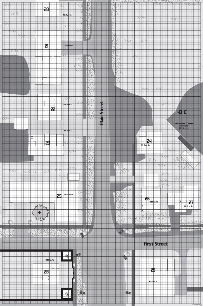 26 – Seemingly abandoned two story home, reinforced (10 DP) – 201 Main St., detached garage. This home is decorated to look abandoned. In fact, when they are in town it is always occupied by no less than three Marauders (five-six when the Marauders are out and about [actual full-fledged gang members not provisional recruits]). They are on guard duty watching the Keep, the flop houses and the visible portions of First and Main streets. Their bikes are kept out of sight in the garage. ANY unwelcome or unauthorized vehicle in town is targeted as soon as they are visible, unless the Marauders are attempting to lure said vehicle and its occupants into town. The invading vehicle is fired upon as soon as the vehicle is in range of the guns at the intersection.
