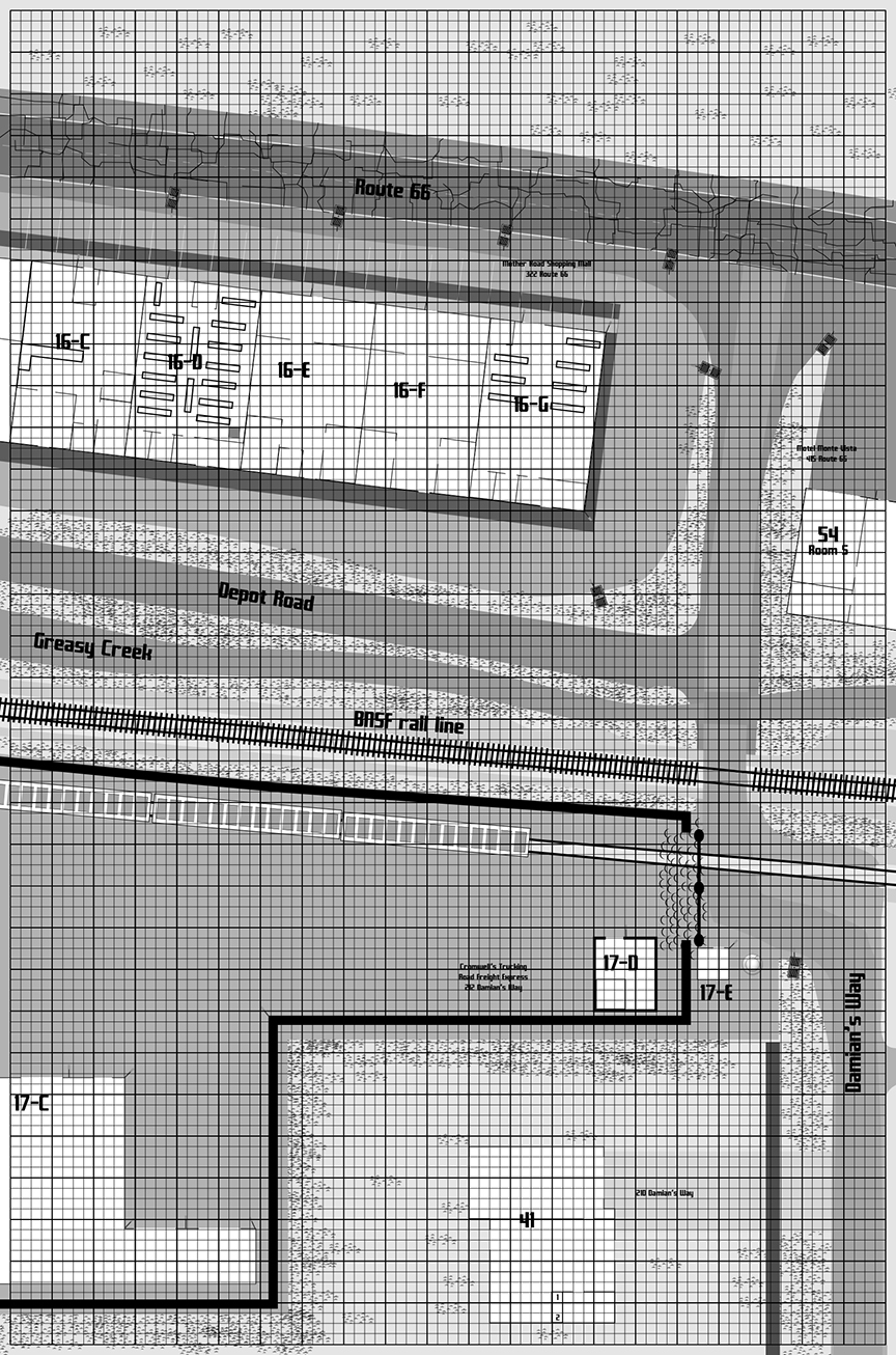 Building 17-C – Warehouse (5 pts metal armor). Continued on Map #4. What’s inside the warehouse? Only the Marauders know for sure. The 15’ tall overhead door operates the same way as the doors at the CoOp and Stop & Shop. The loading dock can accommodate two 52’ trailers at once.