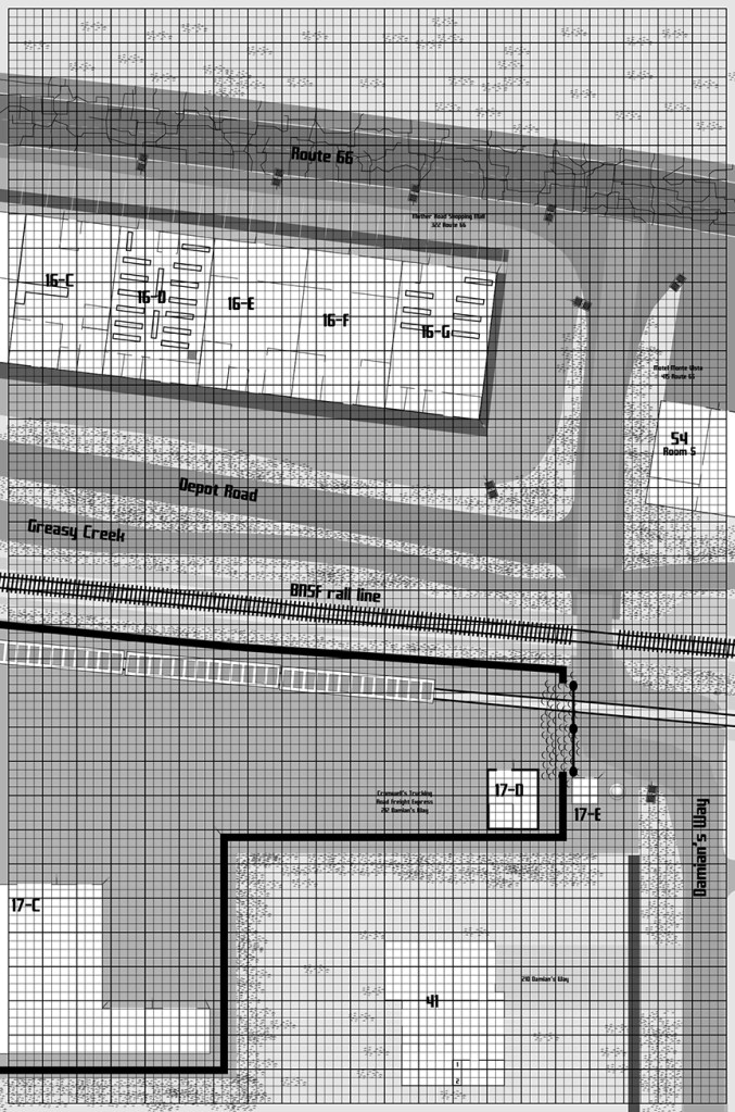 Somehow, somewhere the gang has managed to get a hold of three BNSF Auto Carriers (the rest of the third car is on Map #4). Stored inside each the carriers are six duel ready vehicles. Nicer vehicles “salvaged” from the Flea Market and Motel are taken to the Davis Bros. yard where they are stripped of ANY identifying tech, repainted, and otherwise modified so as not to be traceable back to their former, now missing owners. The carriers are visible to drones and aerial photography, but since the gate to the trucking company is normally closed their existence is not generally known. Only an infiltrator into town with a HIGH degree of investigative skill may be aware of the carriers.