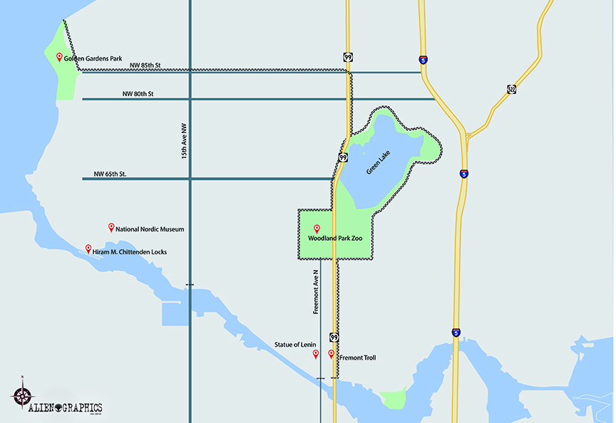 Points of Interest: The Chittendon Locks, watch the boats enter and exit the harbor and keep an eye out for the migrating salmon. Green Lake and the Woodland Park Zoo, the Zoo is no longer animals in cages but rather free-roaming critters that are cared for and protected by a large wall and the locals. The Statue of Lenin at the Fremont/35th St/36th St intersection has been tourist site since the late 20th century. The Fremont Troll is popular spot for tourists but caution is recommended as many visitors to that area have gone missing. The Nordic National Museum is also highly recommended.