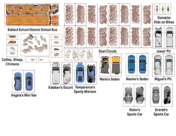 Dust Clouds, Chickens, Sheep and Collies – Animal movement rules are with Map #8. Dust clouds work the same as Smoke clouds except they are automatic. Place one behind each vehicle every time it moves forward. If the vehicle backs up, it runs into a dust cloud and another is placed at the front of the vehicle. If you run out of dust clouds, you can use smoke.