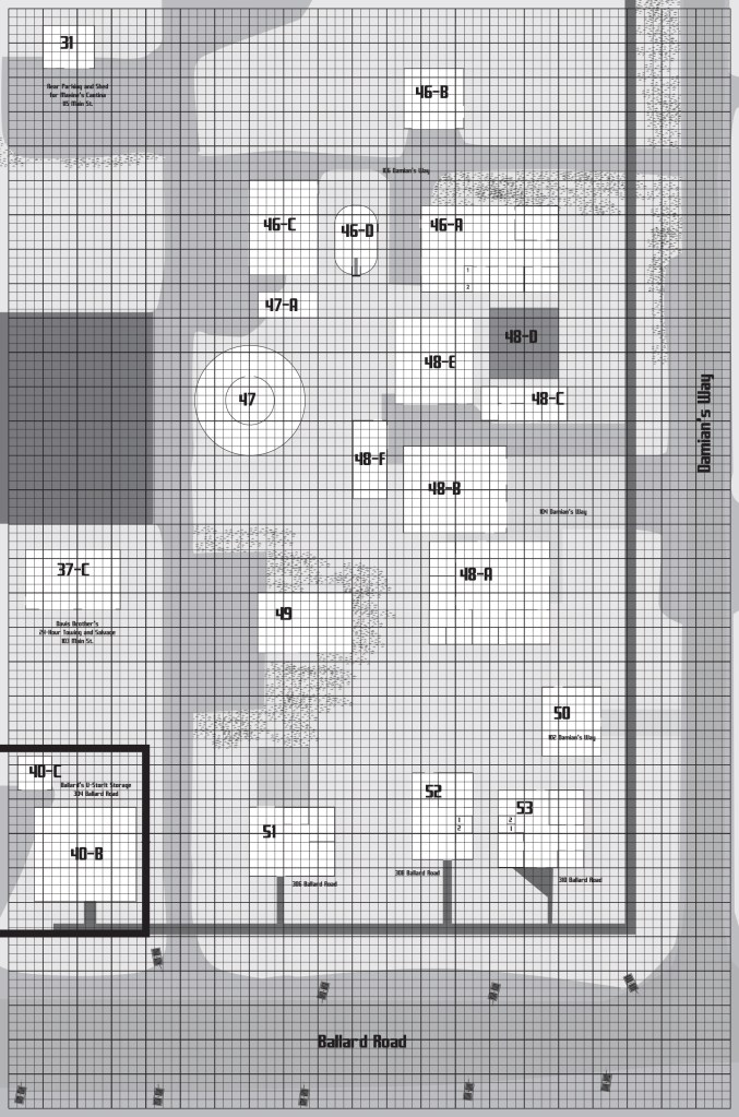 40 – Ballard’s U-StorIt Storage – 304 Ballard Road. Three buildings surrounded by reinforced concrete (40 DP). Monty’s second-in-command, Allan, lives in the single-story home on the property with his girlfriend and kids and guards the facility (see Map #6 description for the family stats). The storage unit is reinforced. It may not look like it but this storage facility is almost as secure as the bank vault. The whole property is protected by the same type of minefield as the CoOp.