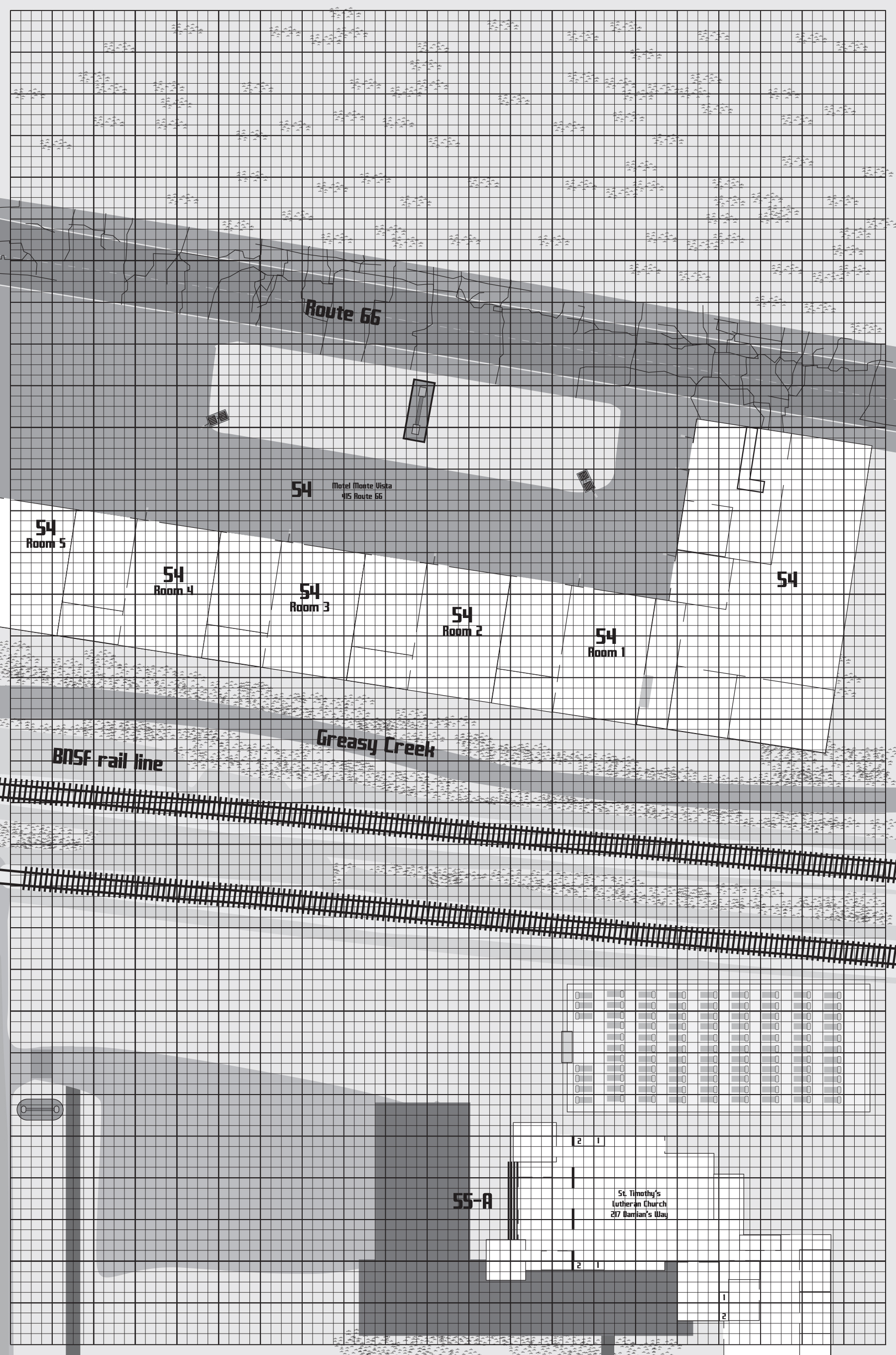 54 – Motel Monte Vista (Brick Structure 10 DP) – 415 Route 66. The hotel is owned and operated by the Vasquez family (Enrique Vasquez – 57; Driver +1, Gunner +1, Hospitality +2, Special FX +2, Isabella – 55; Driver, Hospitality +2, Medic, Sofia – 25; Driver +1, Gunner +1, Hospitality +2, Medic, Gordon – 22; Driver +2, Gunner +1, Cyclist +1, Hospitality +1, Mechanical +2, Special FX +2, Valentina – 18; Driver, Gunner, Hospitality +2, and Gabriela – 16; Driver, Gunner, Hospitality +2). They live in an apartment connected to the Lobby. His oldest son Martin lives at 204 First Street (Bldg #8 Map #2). The Motel has been modified over the years. What used to be a 10-room motel is now a 5-room motel with secure garages attached to each room. Visitors are lulled into some complacency thinking their vehicles are safe from predators while they sleep. It is a 0 Star motel. It would fall somewhere between abandoned rat trap and seedy if the AADA travel guide had ratings that low. The Vasquez family lets visiting family members and distinguished VIPs of the Marauders stay for free (usually in Room #5 but never in Room #2 or #1) and in turn the Marauders protect the property. Rates vary according to what Mr. Vasquez thinks he can charge without scaring travelers away.