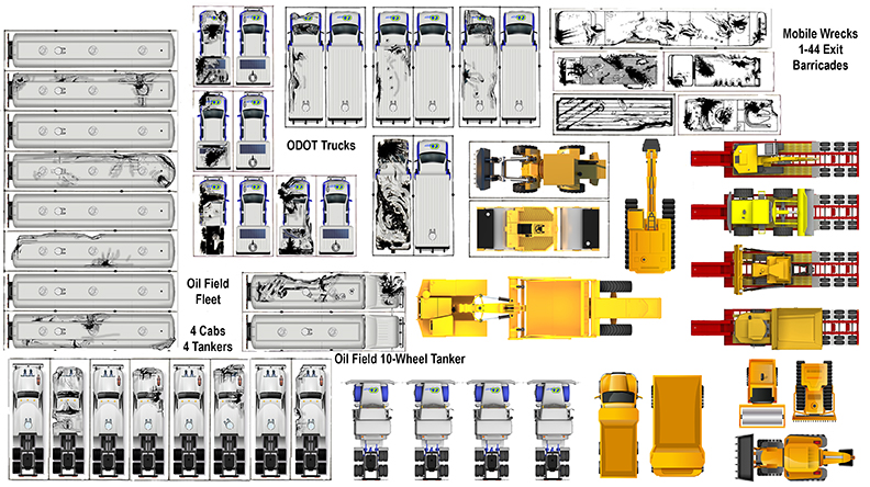 This counter file is not necessary to download if you plan to play in Ballard, OK. That said, all these vehicles are mentioned in the descriptions for Maps #12 and I-44 Bonus of Ballard. This is the complete fleet for the oil field. 4 ODOT Crew Pickups, 4 ODOT 10-Wheel job trucks, Mobile wrecks for the “Barricaded” exits and entrances (not statted) and a whole slew of road working equipment. These are not statted out but they do look pretty.