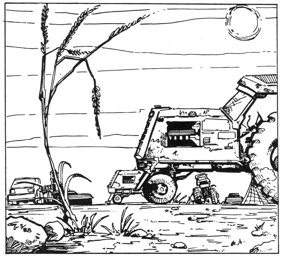 Farmers learned the hard way after the food riots that an unarmed tractor didn’t last too long against local gangs. Single tractors that were armed fared better but only marginally. Farmsteads of the mid-21st century are heavily armed well-fortified communes. Most local communes know they can count on those they feed to come a-runnin’ when they call for help. Raiders and marauders are still out there but they are more organized, better armed, and don’t attack a farming commune without good reason.