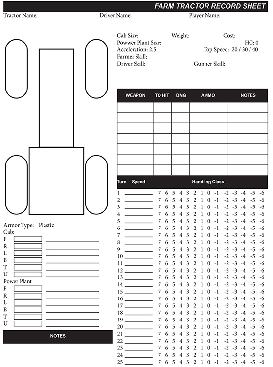 Body Style, Chassis, and Suspension are all based on which power plant you are using, Regular and Large and are included in the base price of the tractor. PTO, running lights, standard agri-computer, GPS, and standard CB radio are included in the base price. Large tractors may mount two side-by-side tires in the rear. Handling class for tractors is always 0. Cockpits have space for the farmer and space for a turret mounted on the roof. Suspension is always considered as off-road. Minor terrain features have no effect on tractors. Any 0-space gear upgrades can be added to a tractor cockpit. Any external gear upgrades can be added so long as it balances out (ie a winch can be added to the front). However, external gear is added at the expense of weapons pods. Dropped Gas or Dropped Liquid pods can be added to the rear if the tractor is not towing equipment.