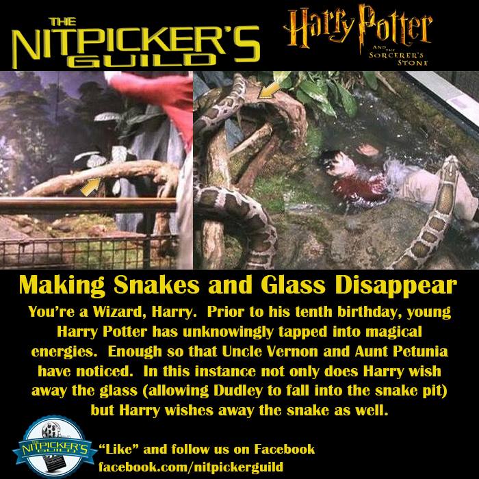 Nitpicking Harry Potter and the Sorcerer’s Stone – Making Snakes and Glass Disappear 16Feb 202329 Jun 2023Add a comment Nitpicking Harry Potter and the Sorcerer’s StoneMaking Snakes and Glass Disappear Return to the Nitpicker’s Guild page Return to the Harry Potter page Return to the Warner Bros. page Share this: Click to email a link to a friend (Opens in new window) Email Click to print (Opens in new window) Print Click to share on Facebook (Opens in new window) Facebook Click to share on X (Opens in new window) X Click to share on Reddit (Opens in new window) Reddit Click to share on Bluesky (Opens in new window) Bluesky Like Loading... Related