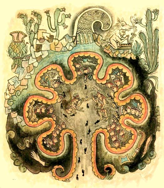 Chicomoztoc — the place of the seven caves. The mythical origin of the “nahuatlaca” tribes. From the “Historia Tolteca chicimeca”. A postcortesian codex from 1550, written by the people of Cuauhtinchan (of Chichimeca ancestry) to sustain their right to their lands, under the Spanish Colonial authorities. They wrote their history from A.D. 116 through 1544, using a mixture of European and prehispanic styles.
