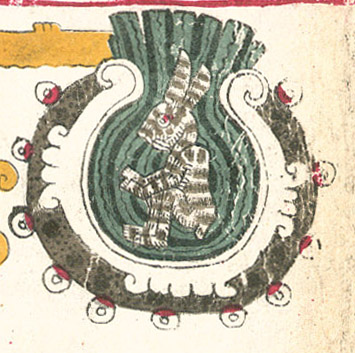 The Aztecs believed that they were living in a universe dominated by generations of sun gods, the current one, known as Tonatiuh, was the fifth. The first three previous suns perished by wind storms, jaguars and fiery rain. The fourth was wiped out by a flood when people turned into fish and spread through the ocean. After the fourth sun perished, the Aztecs believed that the gods assembled to decide which god was to become the next sun. They built a bonfire to sacrifice the next volunteer. Two gods – Nanahuatzin and Tēcciztēcatl – vied for the honor. Nanahuatzin, a poor god, was chosen because he could be spared. Proud Tecciztecatl insisted on the honor, but at the last moment hesitated. Nanahuatzin showed more courage and jumped into the fire. Tecciztecatl gained his courage and followed Nanahuatzin, thus forming two suns in the sky The Moon and Sun were equally bright. Fearing the earth would burn under the light of two luminaries, one of the gods threw a rabbit at Tecciztecatl, and once struck he darkened to become Metztli (also rendered Meztli, Metzi), today’s Moon. Henceforth it is possible to distinguish a figure of a rabbit on the Moon’s surface. During a full moon, the “Rabbit in the Moon” becomes readily visible.