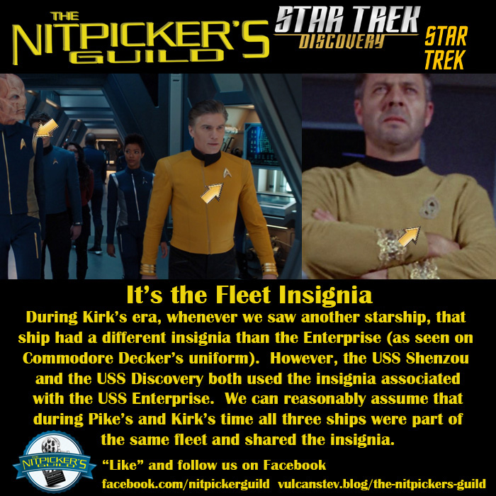 With the airing of Discovery we have seen the Enterprise’s insignia used on various starships. I don’t buy the “Everything has been altered because of ‘Temporal Incursions’ theory.” So we’ll assume that the insignia is not unique to the Enterprise but rather the fleet within Starfleet that she is assigned to.