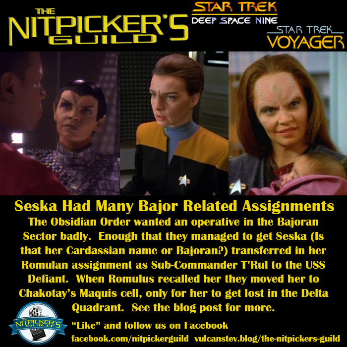 The BIGGER nit isn’t really one that can be shown visibly. Why when she reverts to her Cardassian appearance, does she continue to use the name Seska? Seska was obviously proud of her Cardassian heritage as she reverts to her natural look after moving in with Maj Culluh. So why use a Bajoran name?