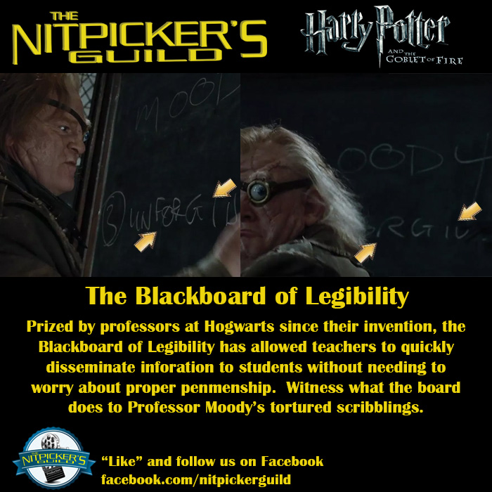 Nitpicking Harry Potter and the Goblet of Fire – The Blackboard of Legibility 28Dec 2023Add a comment Nitpicking Harry Potter and the Goblet of FireThe Blackboard of Legibility Return to the Nitpicker’s Guild page Return to the Harry Potter page Return to the Warner Bros. page Share this: Click to email a link to a friend (Opens in new window) Email Click to print (Opens in new window) Print Click to share on Facebook (Opens in new window) Facebook Click to share on X (Opens in new window) X Click to share on Reddit (Opens in new window) Reddit Click to share on Bluesky (Opens in new window) Bluesky Like Loading... Related