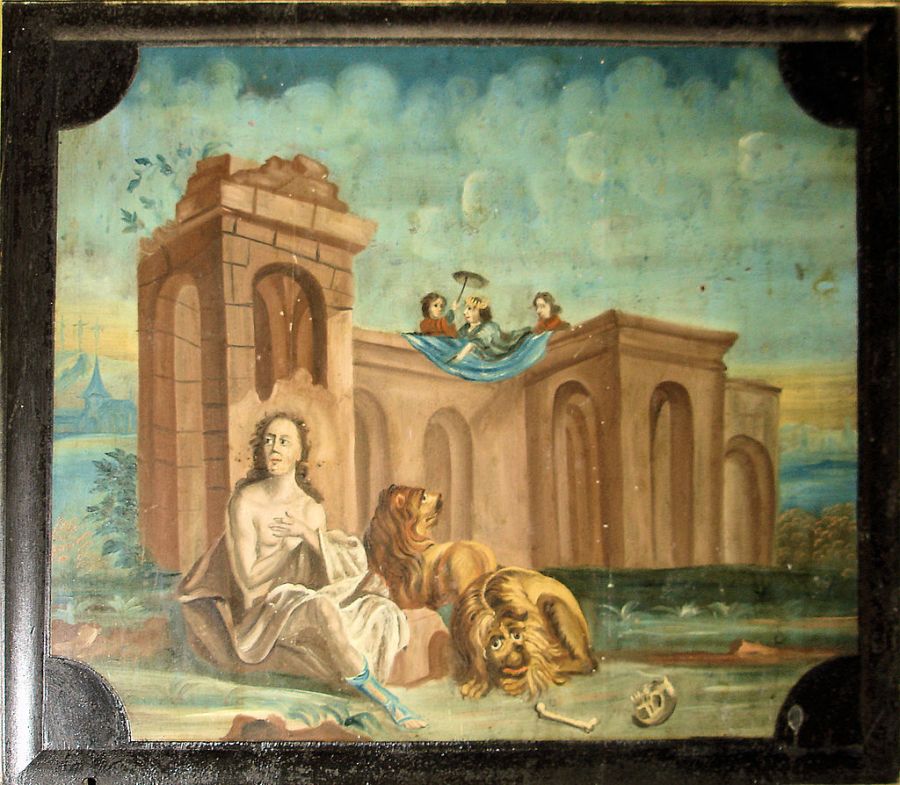 Daniel in the lions’ den with Darius the Mede above.