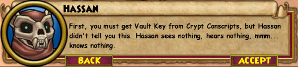 To gain entry into the crypt you will need the Vault Key from the Crypt Conscripts. But Hassan didn’t tell you this. Hassan sees nothing, hears nothing, mmm… knows nothing.