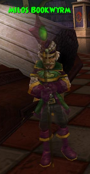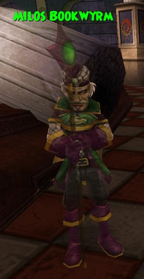Milos Bookwyrm is the Librarian of Dragonspyre, as such he is one of the first characters your wizard meets in Dragonspyre. He is also the focal point for the storyline quests in the outer ring of the city.