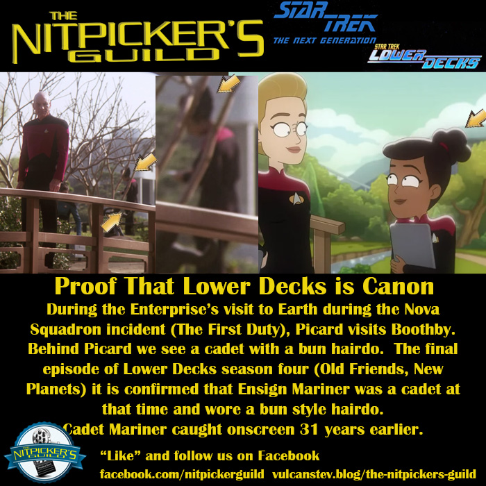 The first is the second season episode of Strange New Worlds wherein Mariner and Boimler time travel back to the time of Pike’s Enterprise (Those Old Scientists, SNW S2 Ep7). The second was found by guild member David W. and his wife Amber. If you watch “The First Duty” when Picard is walking across the Academy grounds to visit with Bootheby, you’ll see a cadet in the background. This cadet looks remarkably similar to Mariner’s flashback appearance in “Old friends, New Planets”. Coincidence? possibly. However the Lower Decks team spends far too much time making sure that the show fits into continuity that it almost has to be intentional that Mariner’s look at the Academy is almost identical to a cadet seen on screen. Thank you David and Amber for this gem.