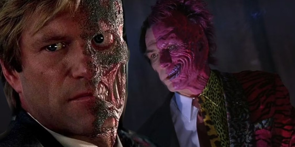 The character has been adapted into numerous forms of media, having been portrayed in live action by Billy Dee Williams in the 1989 film Batman, Tommy Lee Jones in the 1995 film Batman Forever, Aaron Eckhart in 2008 film The Dark Knight, Nicholas D’Agosto on the Fox television series Gotham, and Misha Collins on The CW television series Gotham Knights. Richard Moll, Troy Baker, Eric Bauza, Christopher McDonald, William Shatner, and others have provided Two-Face’s voice ranging from animation to video games. In 2009, Two-Face was ranked as IGN’s 12th-greatest comic book villain of all time.