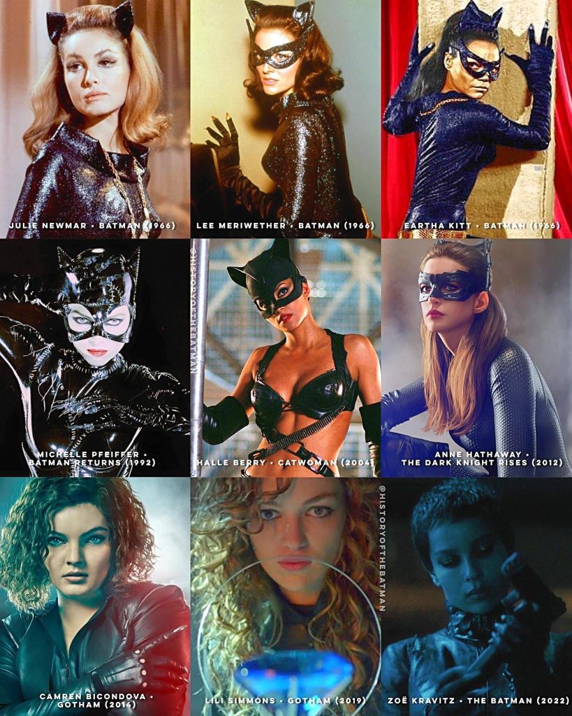 Catwoman has been adapted in various media incarnations, having been portrayed in film by Lee Meriwether in Batman (1966), Michelle Pfeiffer in Batman Returns (1992), Halle Berry in Catwoman (2004), Anne Hathaway in The Dark Knight Rises (2012), and Zoë Kravitz in The Batman (2022). On television, she has been played by Julie Newmar and Eartha Kitt in Batman, where the name Selina Kyle was never used; and Camren Bicondova and Lili Simmons in Gotham.