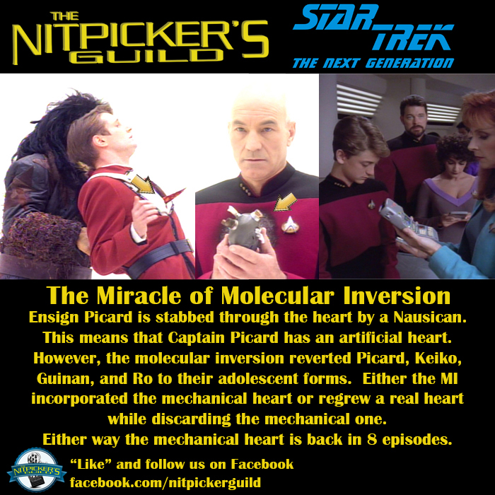 So, did the molecular inversion incorporate Picard’s adult-sized mechanical heart into his now smaller pre-adolescent frame? Was a new heart regenerated? I guess the adult-sized artificial heart was somehow wedged into Picard’s adolescent ribcage and made to work with smaller blood vessels because the mechanical heart is back in the episode “Tapestry”.