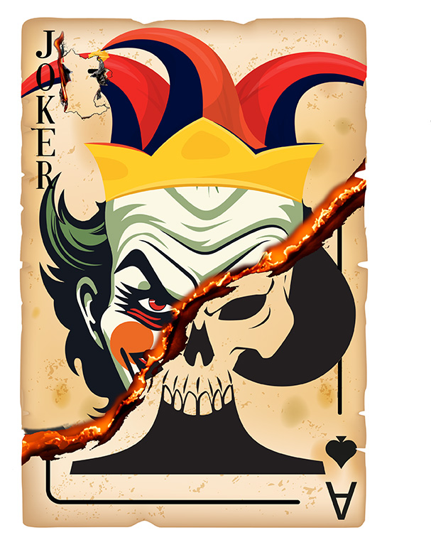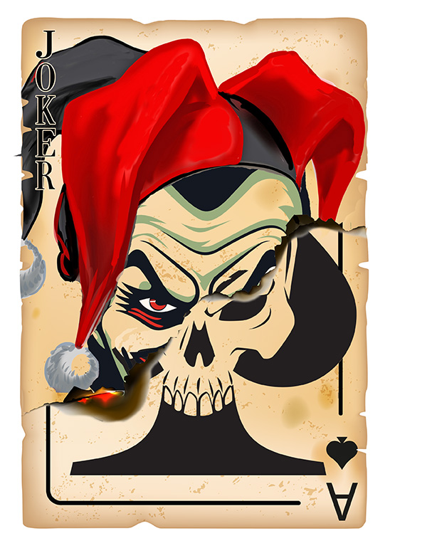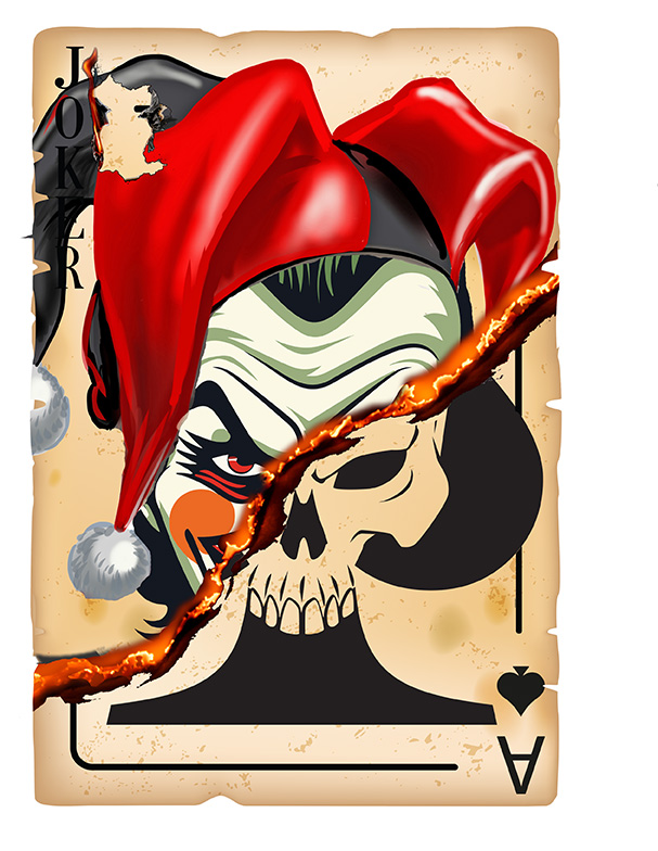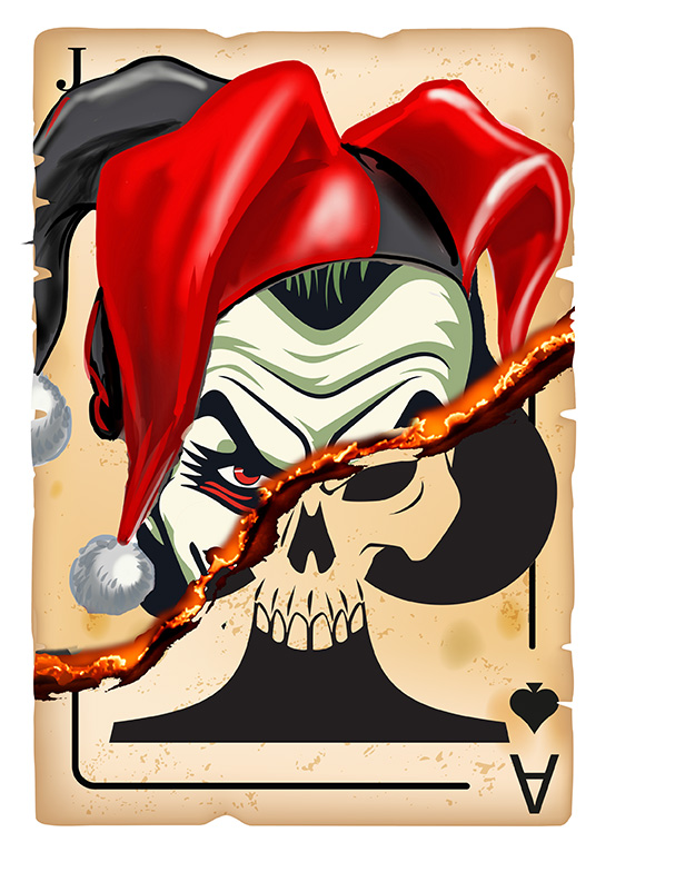 Better, but we needed to included one the joker’s eyes. Also the joker looks too much like The Joker and my client REALLY wanted a jester hat. My idea for more flame was deemed too much