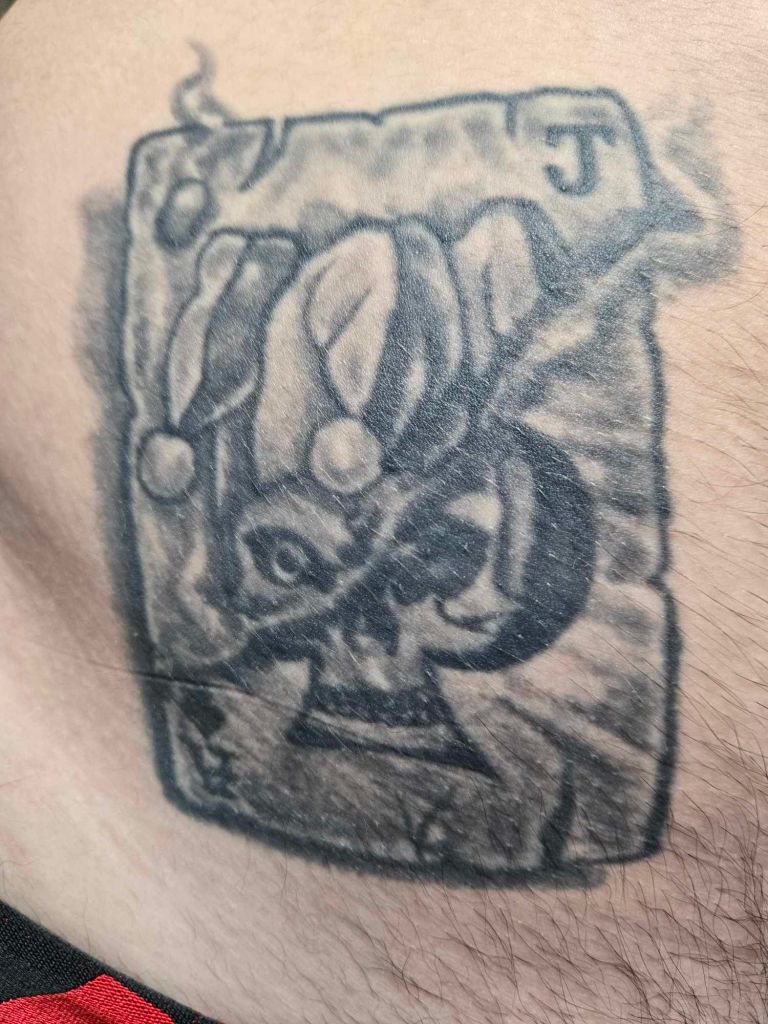 No, we like Joker spelled out. And I muted the white face paint so the weathered playing card shows up better.
