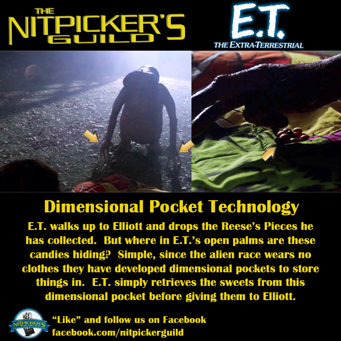 Nitpicking E.T. the Extra-Terrestrial – Where Is ET Hiding the Reese’s Pieces? 16Oct 2024Add a comment Nitpicking E.T. the Extra-TerrestrialWhere Is E.T. Hiding the Reese’s Pieces? Dimensional Pocket Technology Return the Nitpicker’s Guild Page Return to the Universal page Share this: Click to email a link to a friend (Opens in new window) Email Click to print (Opens in new window) Print Click to share on Facebook (Opens in new window) Facebook Click to share on X (Opens in new window) X Click to share on Reddit (Opens in new window) Reddit Click to share on Bluesky (Opens in new window) Bluesky Like Loading... Related