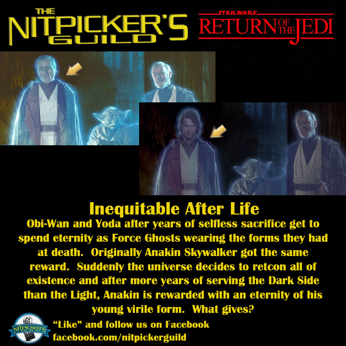 For those of us who remember Return of the Jedi before Lucas made the Special Editions, we recall that Anakin’s spectral form was more in keeping with Sebastian Shaw’s portrayal of a dying Darth Vader (Anakin Skywalker) and this made sense. But suddenly with the Special Edition, Anakin now gets to spend eternity as Hayden Christensen while Obi Wan is stuck as Alec Guinness instead of Ewan McGregor.