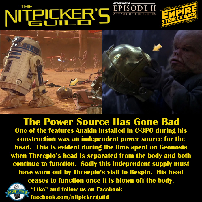 Whatever the explanation it is quite clear that by the time of The Empire Strikes Back, Threepio’s separate head power source has gone bad. He now needs his head attached to his torso to function properly.