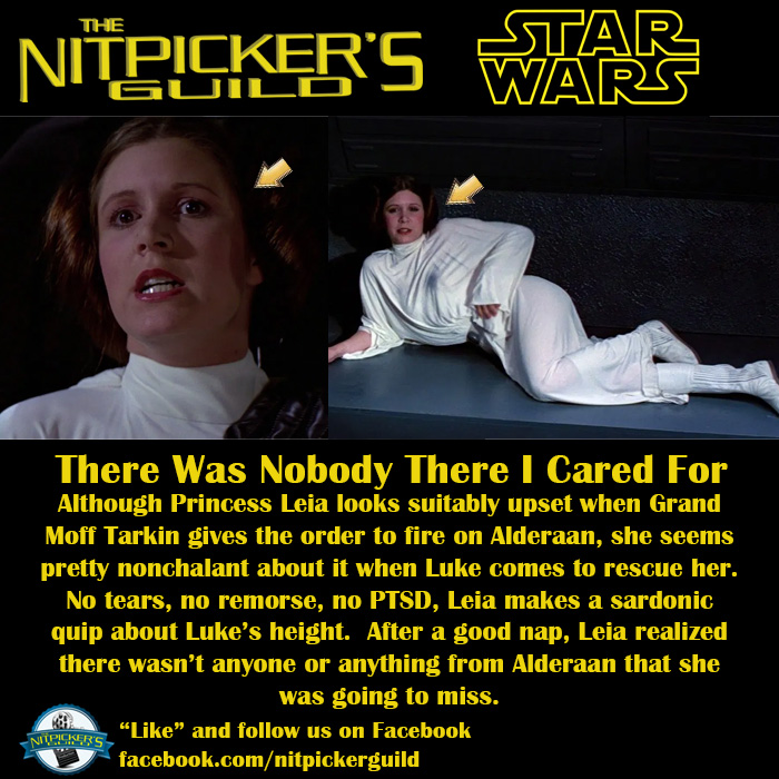 The only time in the entire Saga when Leia shows any kind of emotional response to the destruction of Alderaan as when Tarkin actually gives the order to fire. If I had just witnessed the destruction of my homeworld and then put into the isolation of a prison cell, you can bet that my thoughts would be on what I had lost and it would certainly be showing on my face just a few hours later.