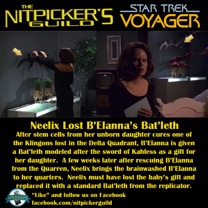 Just a few weeks later after the crew of Voyager has been kidnapped by the Quarren Conspiracy, Neelix brings a brainwashed B’Elanna to her quarters. In place of the baby’s gift a standard Bat’leth now hangs on the wall. What happened? Originally I blamed Neelix. However, after thinking about it, I’m going to blame the Quarren Conspiracy. When they kidnapped B’Elanna from her quarters one of them took a fancy to the Sword of Kahless replica and liberated it. Neelix, realizing the Sword was missing replicated a new one to help B’Elanna reacclimate to Voyager. Being unfamiliar with Klingon Bat’leths, Neelix replicated the WRONG version.