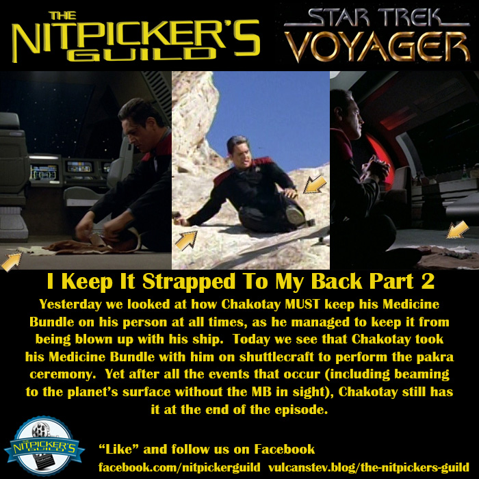 Yesterday we looked at how Chakotay managed to take his Medicine Bundle with him as he kamikazed the Maquis Raider in the Kazon ship. Today we follow up with more proof that Janeway’s First Officer goes to great lengths to keep his medicine bundle close at hand. Thank you to Marc S. for the initial suggestion.