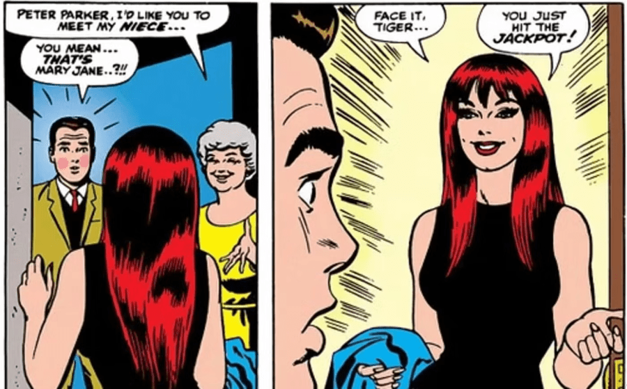 Although she made a brief first appearance in The Amazing Spider-Man #25 with a plant obscuring her face, as part of a then-long-running recurring gag about Aunt May attempting to set Peter up with her friend’s “nice girl” niece, Mary Jane’s first official face reveal was a cameo appearance in The Amazing Spider-Man #42. Designed and drawn by John Romita Sr., her entrance is regarded as one of the most iconic introductions in comic history, owing it to its build-up, her hyper-vibrant red hair and beauty, and her introductory line, “Face it, Tiger… you just hit the jackpot!”. Since then, ‘Tiger’ has been her most recognizable nickname for Peter, spanning comics and media adaptations, with the character becoming the third to assume the superhero mantle of Jackpot in August 2023.