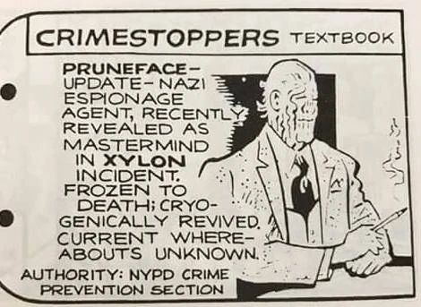 Pruneface first appeared (and apparently died) in 1942, having nearly frozen to death due to exposure during a shootout with the police. The character was revived in 1983. The 1983 story explains that he had been used in an early cryogenics experiment by Dr. Kryos Freezdrei and is reanimated using modern medicine. Freezdrei uses Pruneface’s revival as a publicity stunt, however, to advertise the services of his cryogenics institute to the wealthy and gullible, whom the doctor and Pruneface plan to bilk for millions which would go towards funding neo-Nazi groups. This storyline ends with the bombing of the institute, Freezdrei’s apparent death and Pruneface’s disappearance, all at the hands of a Mossad agent. A cryogenics tube containing the frozen body of Adolf Hitler can be seen in the background as a fire destroys both him and the institute.