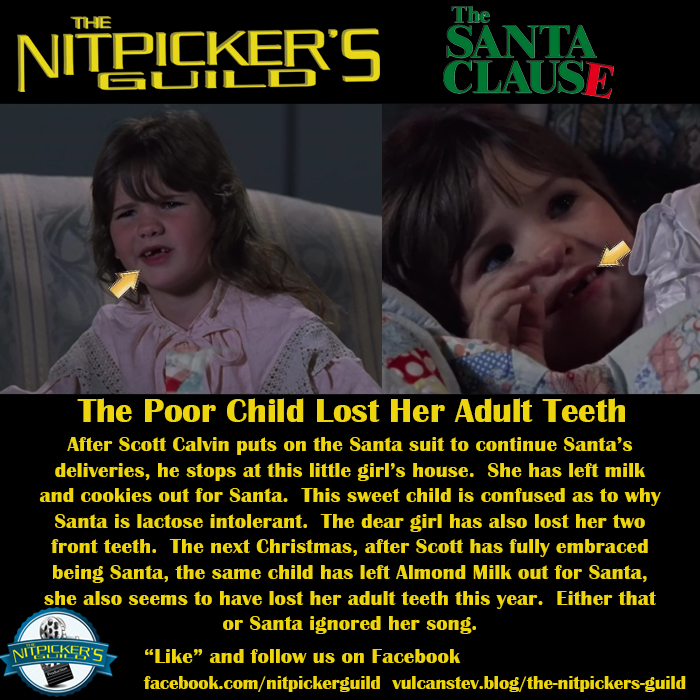 Ashya T’sai and I have been watching our Christmas movies. (Lethal Weapon, Home Alone, Die Hard, Gremlins, White Christmas and The Santa Clause Trilogy). We noticed something. Now as all nitpickers know these two scenes take place a year apart (not filmed back to back with a change of costume). This poor little girl is still missing her two front teeth a year later.