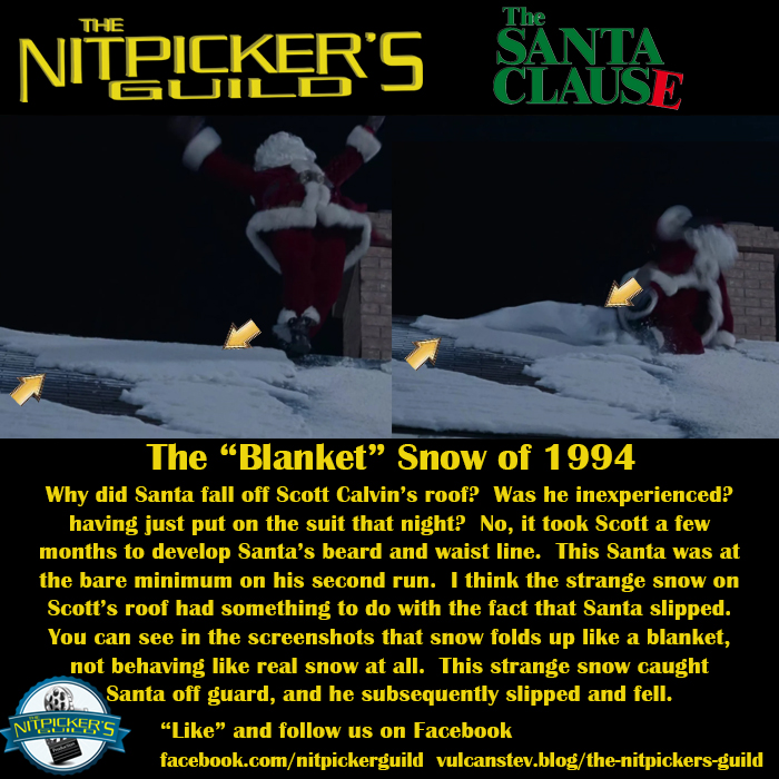 Now, we know that this scene takes place Christmas Eve in a Chicago suburb and NOT in Toronto sometime between April 26, 1994 – July 9, 1994. So it must be the strange blanket like qualities of this Christmas Eve snow that caused Santa to fall.