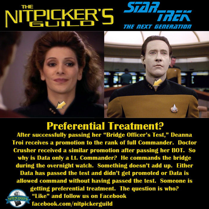 So why is Data allowed to command the night watch without being a full commander? For that matter, why was Worf in command of the bridge on the last shift of the day watch in Data’s Day (S4 Ep11). Do Worf and Data get preferential treatment because they are members of the senior staff? Or did Worf and Data pass the Bridge Officer’s Test and NOT get promoted?
