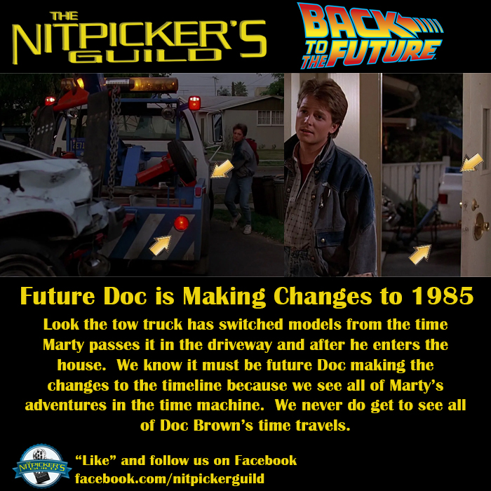 When Marty arrives home the tow truck is larger truck with a Tow Truck bed mounted straight to the frame. Once Marty enters the house the tow truck is now a pickup with a towing apparatus installed in the bed of the pickup. It must be Doc because it’s not like the interior of the house was filmed on a soundstage and the producers couldn’t fit the larger tow truck on the stage.