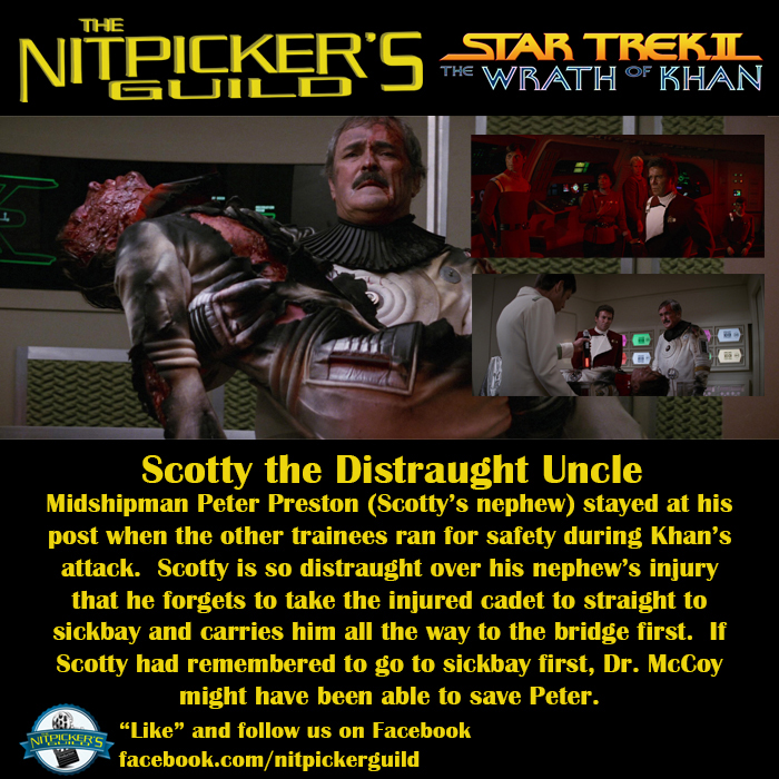 I’ll forgive the fact that Scotty carried him out of Engineering as transporters could’ve been down to the attack. So we’re left with either the Distraught Uncle not realizing where he was going. Or it’s an Angry Uncle wanting the Captain to see what his hubris has wrought. Either way, Scotty blew it.