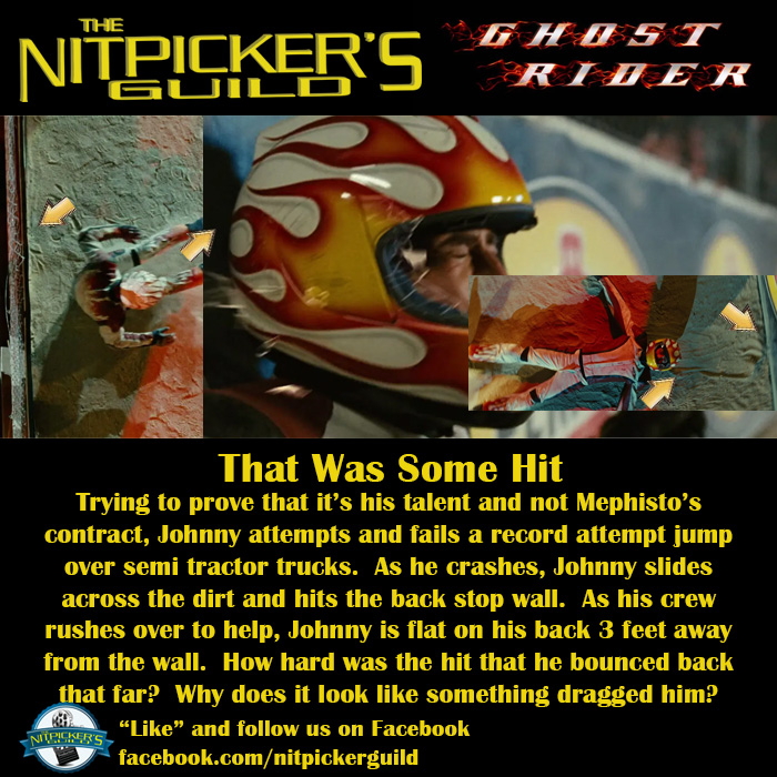 According to Google AI, for Johnny to bounce off the wall that hard he needed to be traveling at traveling at approximately 18 feet per second (about 12 mph) at the moment of impact. This is survivable. But let’s be honest, given the severity of the initial crash and subsequent slide across the dirt, I think Mephisto had a hand in keeping his Spirit of Vengeance alive.