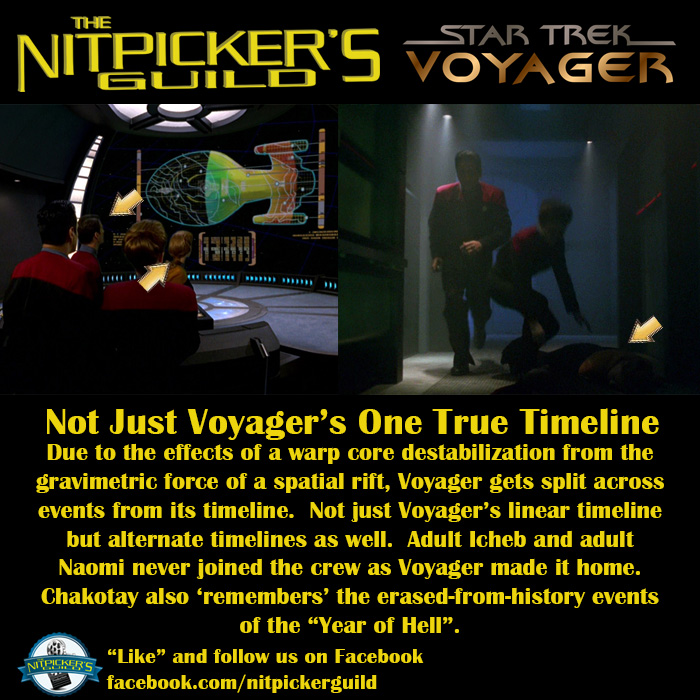 A temporal phenomenon fractures Voyager into sections that exist at different points in time, and Commander Chakotay must fight old adversaries to restore the ship to normalcy. As stated in the meme, it’s not just different points on Voyager timeline but points of alternate history timelines as well. It must be explained by the specific frequency of the chronokinetic surge from a rift in space interacting with the ship’s warp core. It must also account for the Chakotay’s ability to move back and forth across points separated by distance as well as time and dimension.