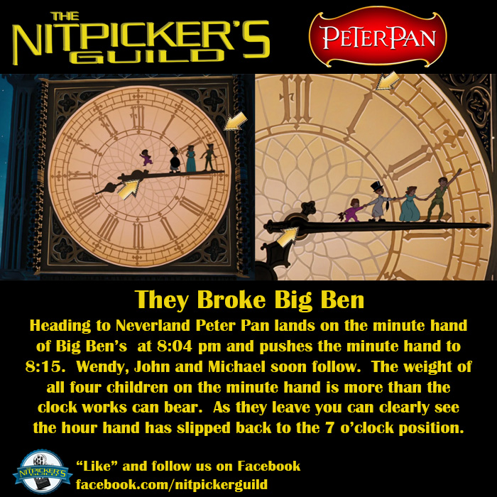 I LOVE finding nits like this in animation. Unlike live action nits that can occur naturally and unintentionally, animations nits are deliberately included in the film. So whatever Disney artist was responsible for this nit, it leaves us to conclude that Peter, Wendy, Michael, and John broke The Great Clock at Westminster.