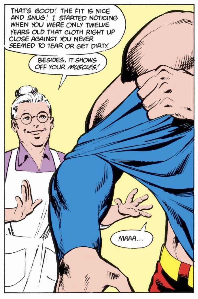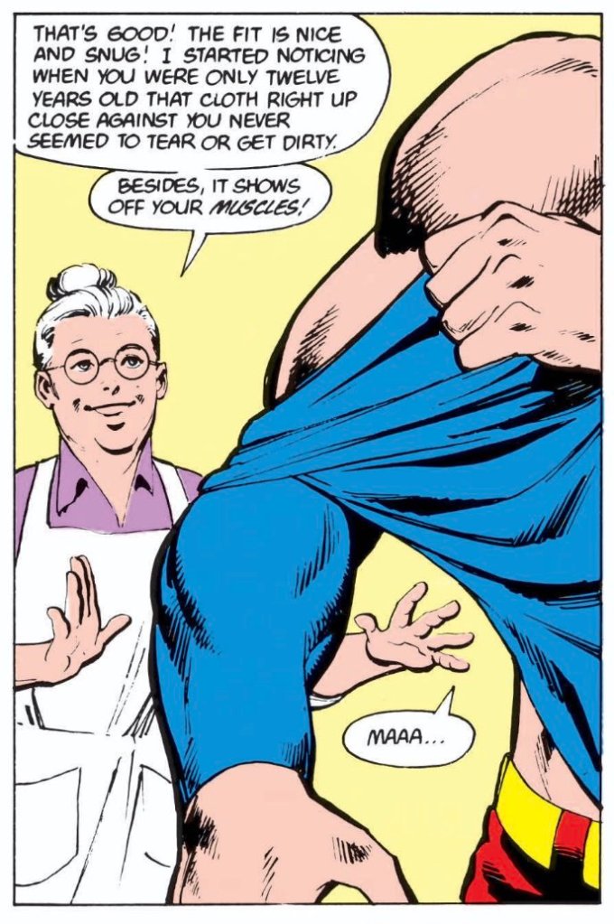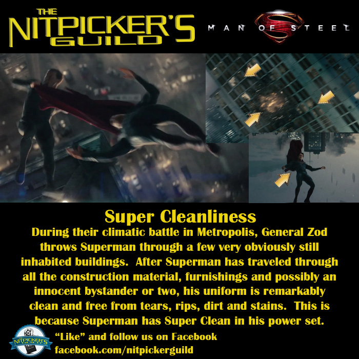 No, really. I know this is a technical violation of the rules of nitpicking in that no non-canonical extra source material shall be used in explaining a nit. That said, John Byrne’s 1986 seminal work on the origins of Superman have been the basis for the character for most Superman canon since its publication. Here is the panel in question that specifically states Superman has Super Cleanliness in his power set.