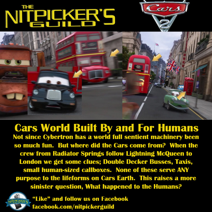 If the cars in Cars developed on their own, in addition to the points raised by the meme; why are there door handles on all the buildings? Why do they cars have doors? door handles? Side windows? mirrors?