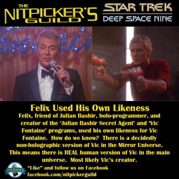 It’s a nice cameo to be sure. However, fandom has been asking the question “How can a hologram be a real person in the Mirror Universe?” since February 1, 1999 (original airdate of “The Emperor’s New Cloak”). The answer of course is; that’s not Mirror Vic, that’s Mirror Felix [last name unknown], creator of the Vic Fontaine program in the prime universe. He just used his own likeness (just like Doctor Zimmerman did for the Holodoc) to create Vic.